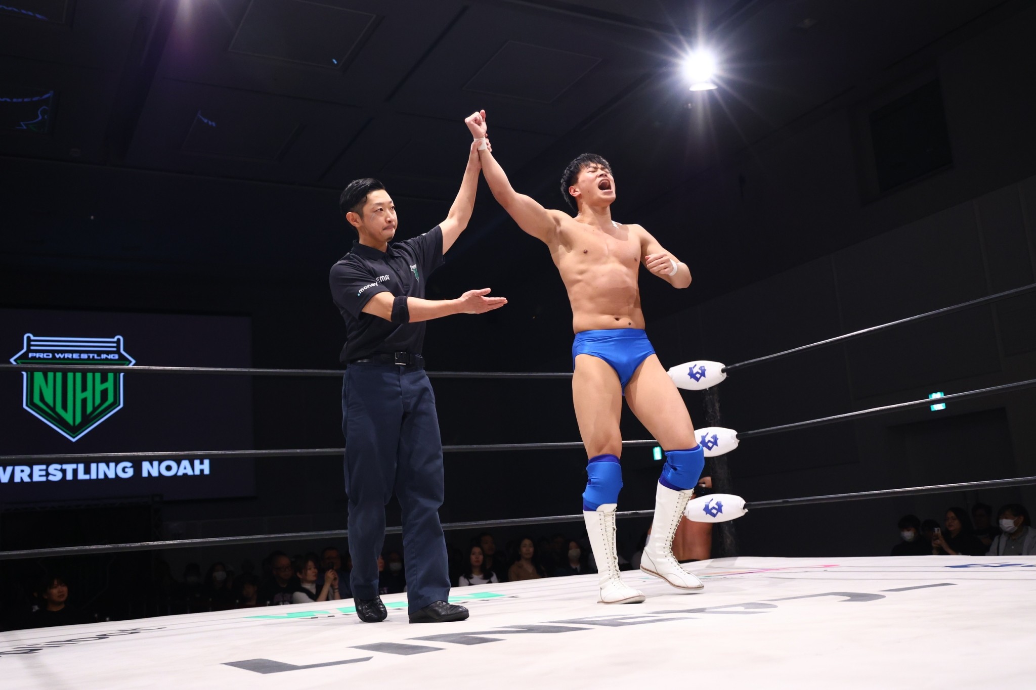 【稲畑の話】「よし、よし。関西での3連戦最終日、大阪。僕の地元で勝利できました! Hi69さん、ブラめんさんと『NOAH Jr. TAG LEAGUE 2026』で因縁があった3人でした。そこで今日やり返しができたんじゃないかなと思います。自分はこれで終わるつもりはありません。清宮さん、昨日戦って、NOAHのトップとの差がわかりました。自分はそこに追いつけるよう、そして追い越せるように、これからも精進していきます。ありがとうございました!」