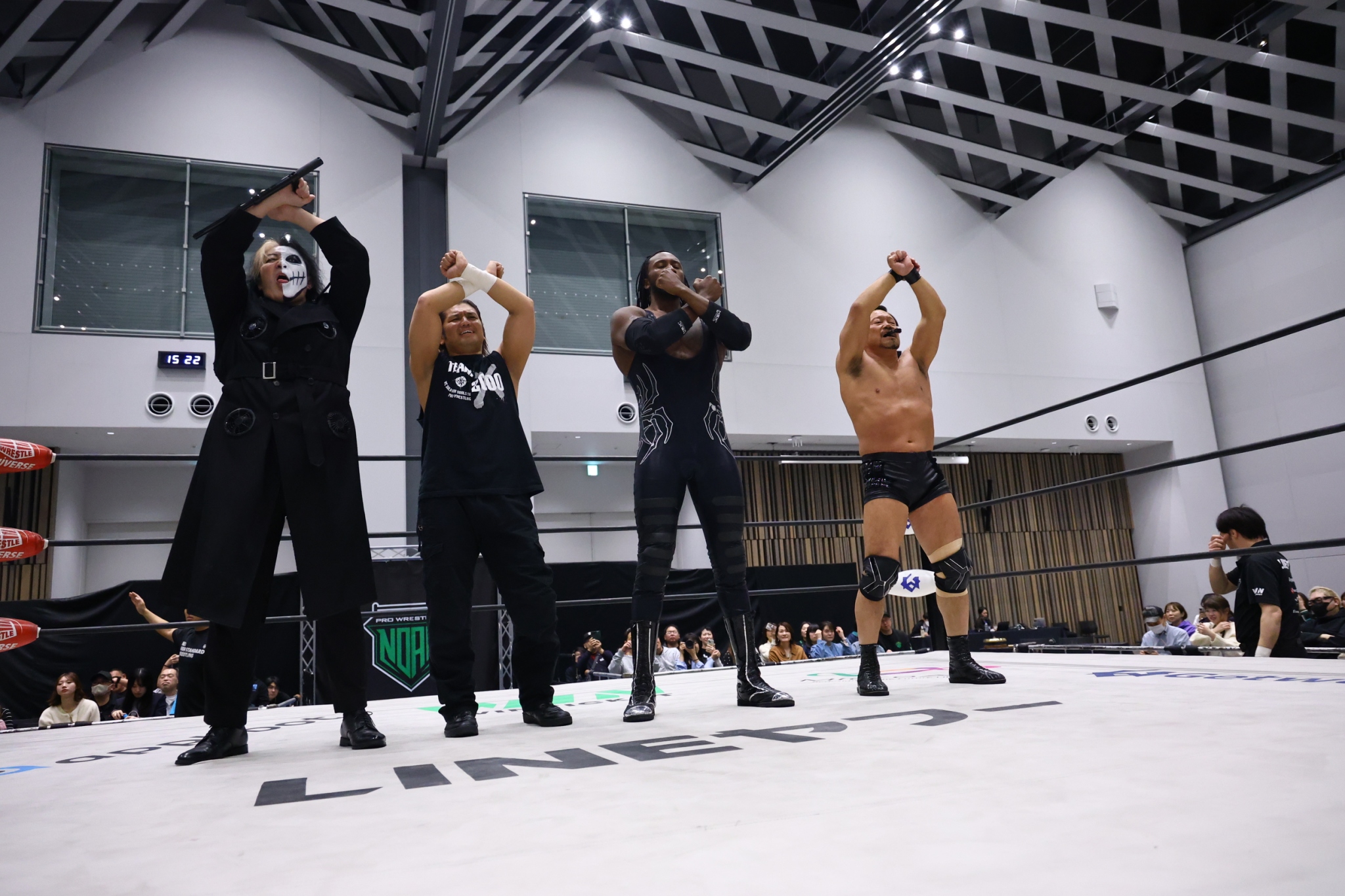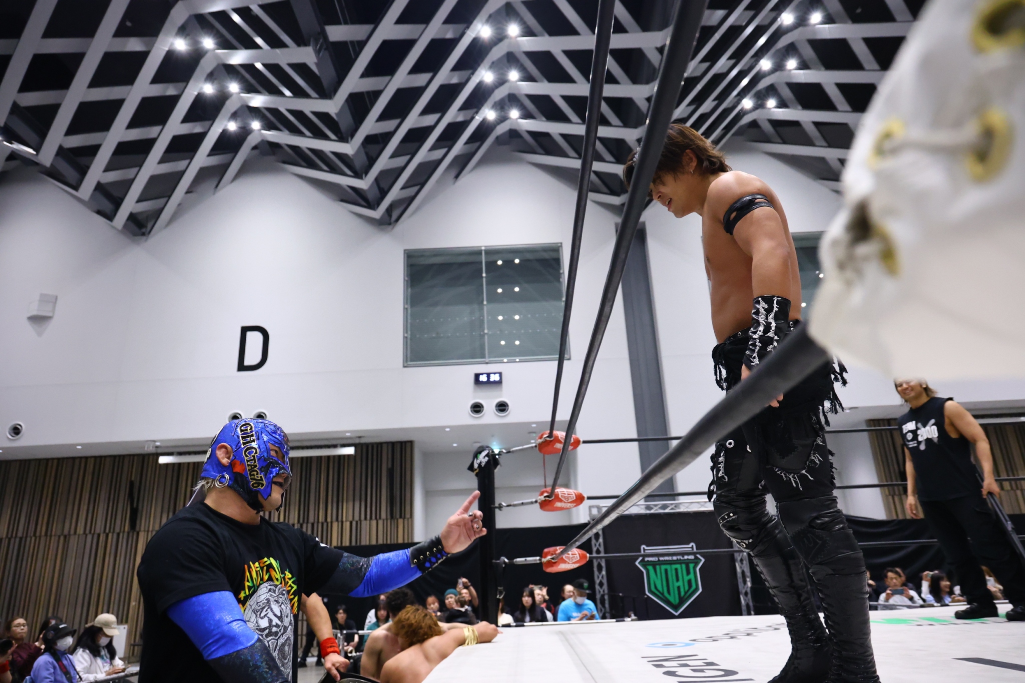 【内藤の話】「いやいやいや、アルファ・ウルフ選手、見た? (目を見開いて)こうやってたね。もしかして、彼の中で気に入っちゃった? じゃあ、いろんな国でこのポーズをやればいいよ。内藤の真似をしているんだねって思われるだけだと思うけどさ。このプロレスリング・ノアのリングに上がるようになって。今日、たま未来メッセ、この会場も初めて来たし、今日リング上で初めて対戦する選手もいっぱいいたし、なんか毎日が楽しいな。会場もそうだし、対戦相手も含めて、毎日が楽しいよ。この楽しい日々を続けるためには、やっぱりこのGHCタッグ王座が必要なわけで。この王座を守り続ければ、またこのリングに立たなきゃいけないわけでしょ。立つことになるんでしょ。じゃあ、是が非でも防衛したいね。名古屋でのタイトルマッチ、メインイベントじゃないかもしれない。ってことは、大合唱はないかもしれない。でも、今現在の内藤&BUSHI、今現在のLOS TRANQUILOS de JAPONのプロレスを名古屋のお客様にお見せしますよ。楽しみにお待ちください。では、明日、ふじさんめっせでまたお会いしましょう。アディオス」