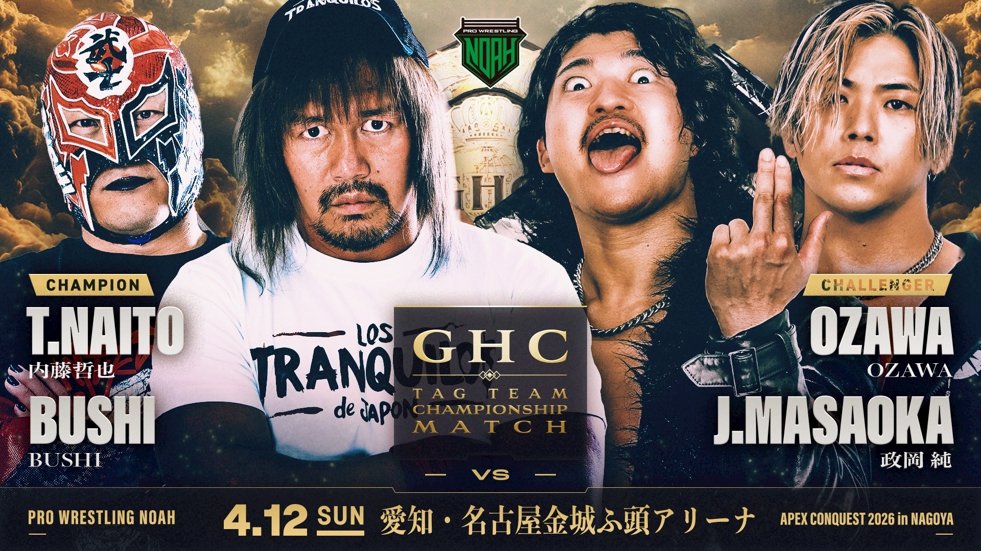 今年からロス・トランキーロス・デ・ハポン、そしてGHCタッグ王者としてNOAHマットに継続参戦している内藤哲也&BUSHI組。4・12名古屋大会ではOZAWA&政岡純組相手の防衛戦に臨む。