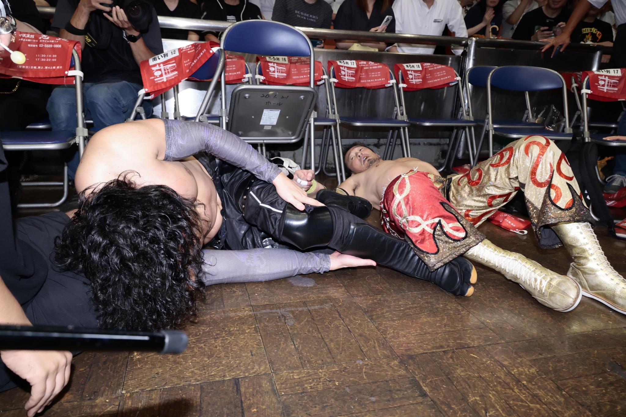 ▼ヒロム「もういいよ。早すぎるって。何人来たんだよ? 早すぎるよ。もうちょっと味わわせてくれよ。待ちに待ったGHCのベルトだぞ。ホント好きだったベルトだよ。まずYO-HEY選手、最高でした。YO-HEYちゃん、凄い楽しかった。あなたがもし、あと3キロ、いや5キロかな。それぐらいウェイトが重かったら結果は変わったかもしれない。正直あんなしんどいと思わなかった。ドロップキックなんてヤングライオンの時、何回使ったか、何回食らったか数えきれない、一番食らった技かもしれないってぐらい練習でも何べんも食らった。その技があんなに威力を持つのか。あと5キロ、いや3キロだな。違ってたら意識が吹っ飛んで回復しなかった。恐ろしい。でも楽しかったです。シンプルに敵地なのにこんなに楽しい思いができたのは、ヒロムちゃんの日ごろの行いがいいからかな。ありがとうございました。NOAHの皆様。リング上でも言った通り、ノアジュニアは責任をもってこの俺が盛り上げるんで。どっかの誰かみたいにベルトを壊したり、ましてや投げたりなんていたしません。俺は正面から思いっきりノアジュニアを盛り上げてみせます。小田嶋選手、小峠選手、(しばらく考えてから)ちょっと待ってくれ。忘れた忘れたなんて言ってたら本当に忘れちゃった。宮脇選手! 危ねえ。これは今のはね、決してわざとじゃないです。試合後のダメージで誰が入ってきたか思い出せないんです。それぐらいのダメージを負ってるのは確か。そして何よりもEita選手。このベルトを獲る前からあなたとシングルマッチをしてみたかった。ノアジュニアの顔と言ってましたけど、本当にノアジュニアの顔だと思ってます。今日で俺のノアジュニアの歴史が動きました。今までは丸藤さん、KENTAさん、小川さん、菊地さん、橋さん、マイケル・モデスト、杉浦さん、そして金丸さんで時が止まっていたノアジュニアが今日のYO-HEYさんとの闘い、そしてそのあとで動き出しました。動き出し始めました。これから楽しみにしています。今日は喜ばせてくださいよ。(取材陣に向かって)どうしたんですか? 質問タイム設けましょうか? 今凄くいろんなこと言いましたけど、メイン見なくて大丈夫ですか? 皆さん。ないなら行きますけど」