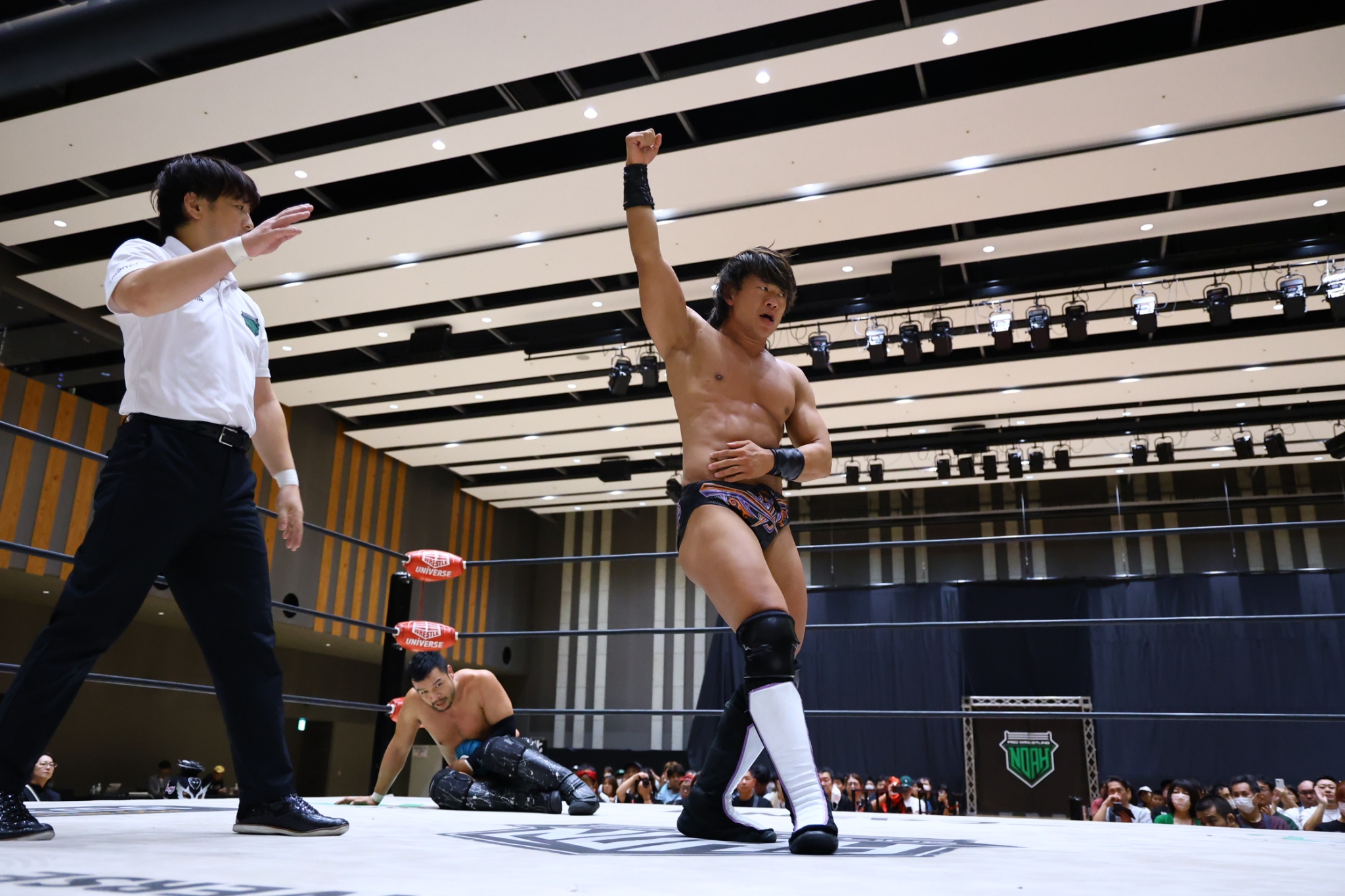 【遠藤の話】「初めてのN-1、最後GHCヘビーのチャンピオンKENTAに勝って、有終の美を飾ることができました…じゃないんだよね。ブロック通過もしてないし、NOAHに来てもうすぐ1年経つけど、ベルトは獲ったけど、一番上のGHCヘビー級のベルトは獲ってないし。もうすぐ1年経つけど、俺自身、結果を残したとは言い難い。だから、この場で言うぞ。来年のN-1一枠、俺に寄越せ。来年こそN-1制覇してやる。それだけ。まあ、何を言いたいかっていうと、ショートスリーパーの俺が昨日7時間寝て、バスでも2時間寝たから、今日KENTAを倒すことができたってこと。それだけ」